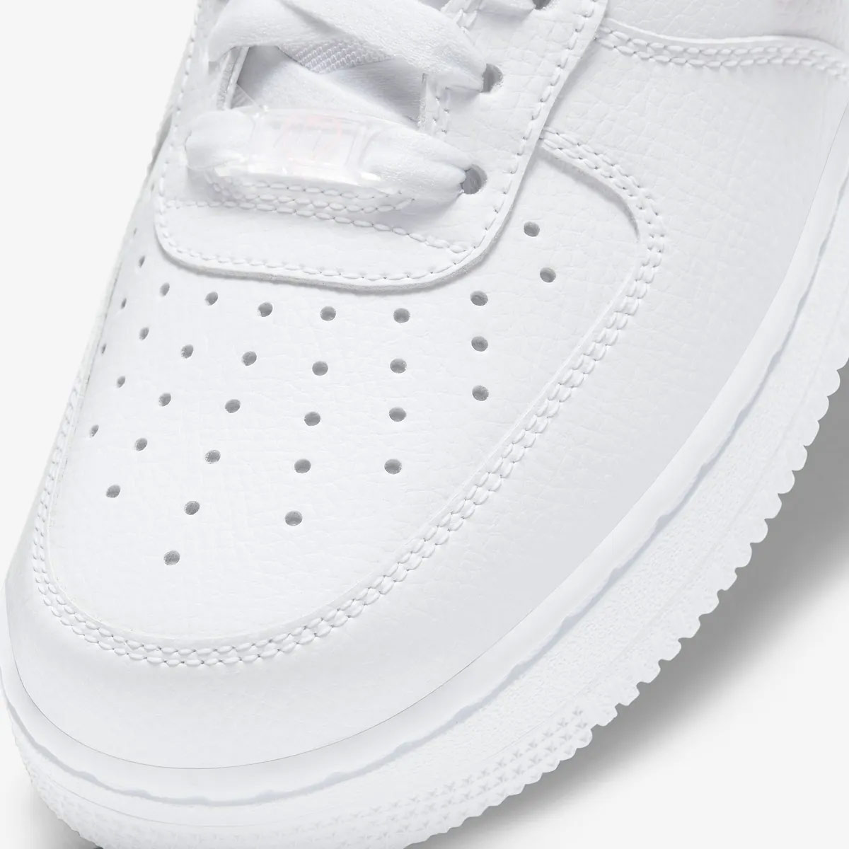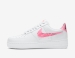 Upper được làm bằng da trắng premium, mềm và bền, mang đến sự sang trọng nhưng vẫn dễ phối đồ. Các chi tiết hồng pastel được đặt tinh tế ở gót giày, logo Nike Air, lưỡi gà và đường viền branding giúp tổng thể hài hòa và dịu mắt.