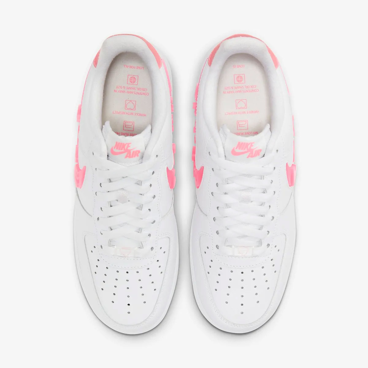 Heel tab màu hồng đi kèm biểu tượng trái tim và logo Nike Air màu đen tạo điểm nhấn đầy tinh nghịch. Lớp lót giày (sockliner) được in thông điệp đáng yêu như “Handle With Respect” và “My Love Runs Hot” sự tinh tế chỉ xuất hiện ở phiên bản Valentine. Đế Air Force 1 quen thuộc với midsole dày dặn, êm ái, bền bỉ giúp hỗ trợ tốt trong mọi hoạt động hàng ngày.