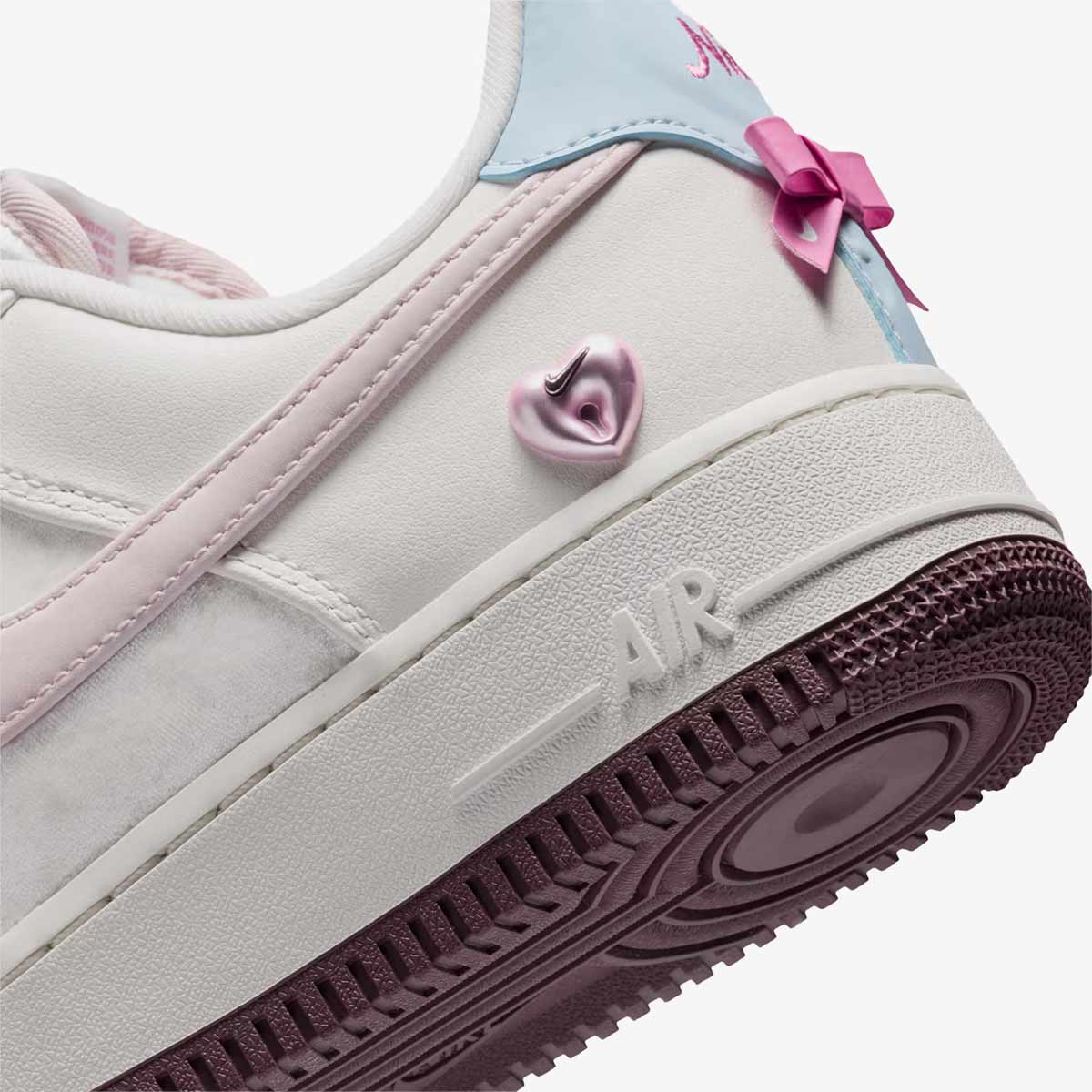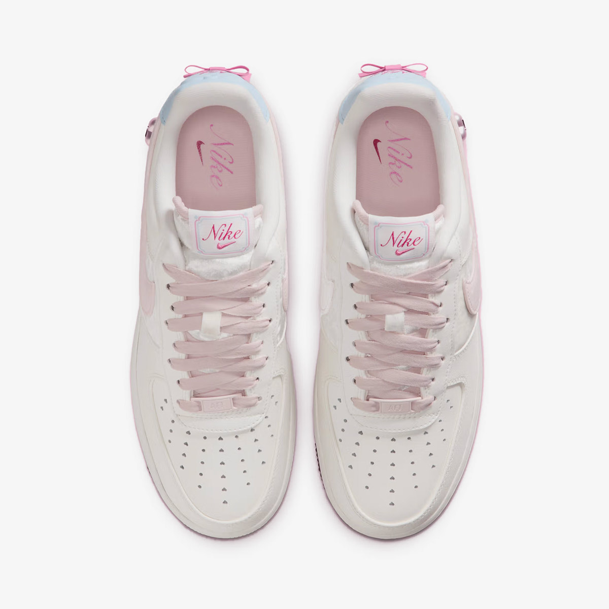 Phần upper của giày sử dụng da màu Sail (trắng ngà) cao cấp, mang lại cảm giác sạch sẽ, trang nhã và dễ phối đồ. Điểm nhấn nổi bật nằm ở logo Swoosh màu hồng nhạt, kết hợp hoàn hảo cùng dây giày đồng màu, tạo nên cảm giác mềm mại và nữ tính. Các lỗ thoáng khí ở mũi giày được tạo hình trái tim, vừa đủ để thể hiện chủ đề Valentine 2026 nhưng không gây rối mắt. Ở phần gót, Nike khéo léo thêm nơ ruy băng nhỏ, logo Nike thêu tinh xảo cùng mảng da Light Armory Blue nhẹ nhàng, giúp tổng thể thêm phần cuốn hút.