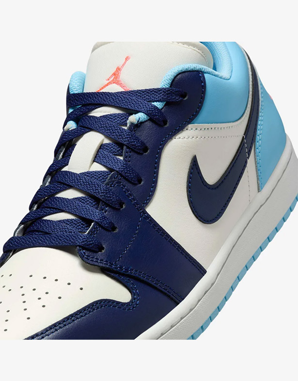 Phần thân giày Nike Air Jordan 1 Low “Blue Chill” được làm từ da cao cấp, mang lại độ bền và cảm giác sang trọng. Bảng màu kết hợp giữa nền trắng tinh khôi, lớp phủ xanh nhạt và Swoosh xanh navy đậm, tạo nên vẻ ngoài bắt mắt nhưng vẫn dễ phối đồ. Các chi tiết đặc trưng như Jumpman trên lưỡi gà và wings gần gót giày thể hiện di sản của thương hiệu Jordan cam ấm áp. Lỗ thoáng trên mũi giày đảm bảo độ thông thoáng, trong khi cổ giày đệm êm ái mang lại sự thoải mái suốt cả ngày.
