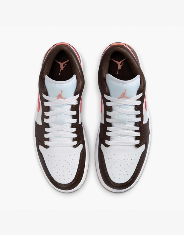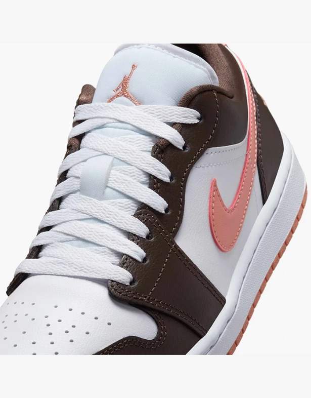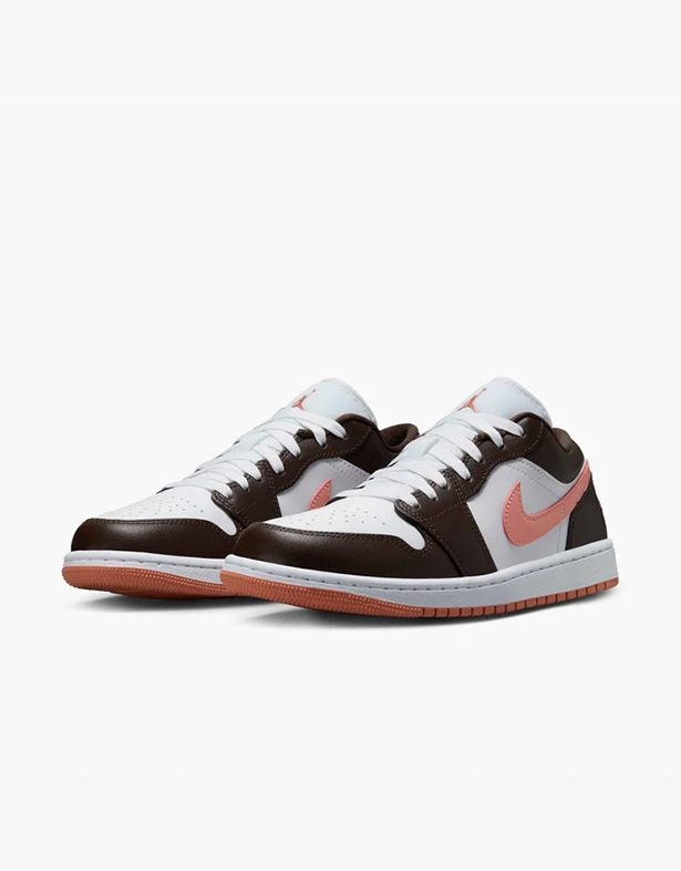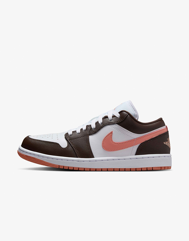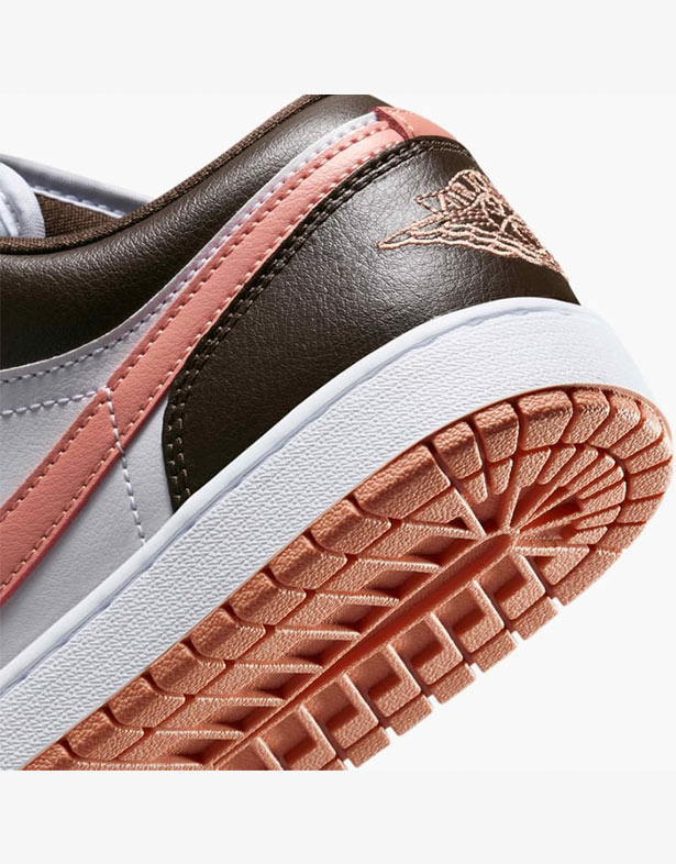 Thiết kế của Nike Air Jordan 1 Low “Brown Pink” giữ nguyên silhouette thấp cổ đặc trưng của dòng Jordan 1 Low, mang lại sự thanh lịch và dễ phối đồ. Phần upper được làm từ chất liệu da cao cấp, kết hợp giữa lớp lót êm ái và bề mặt bóng mịn, đảm bảo độ bền cao đồng thời tạo cảm giác sang trọng. Tông màu chính là nâu đất làm nền tảng, được điểm xuyết bởi các chi tiết hồng nhạt ở Swoosh logo và phần viền, tạo nên sự tương phản nhẹ nhàng nhưng đầy cuốn hút. sắc màu nâu hồng mang đến sự tươi mới, giúp đôi giày dễ dàng kết hợp với quần jeans, váy midi hoặc thậm chí là trang phục công sở.