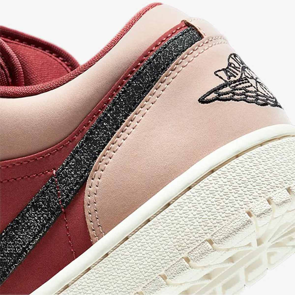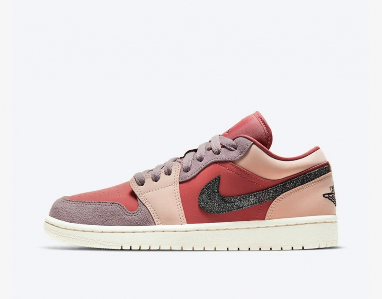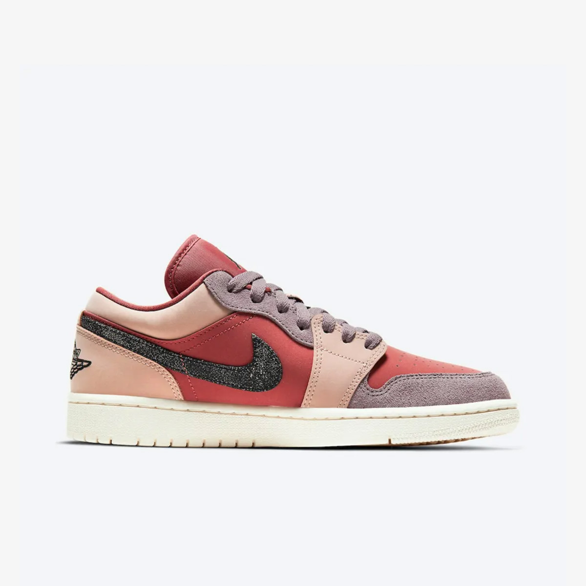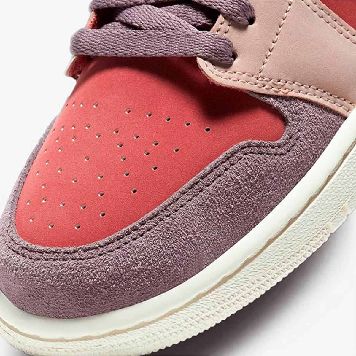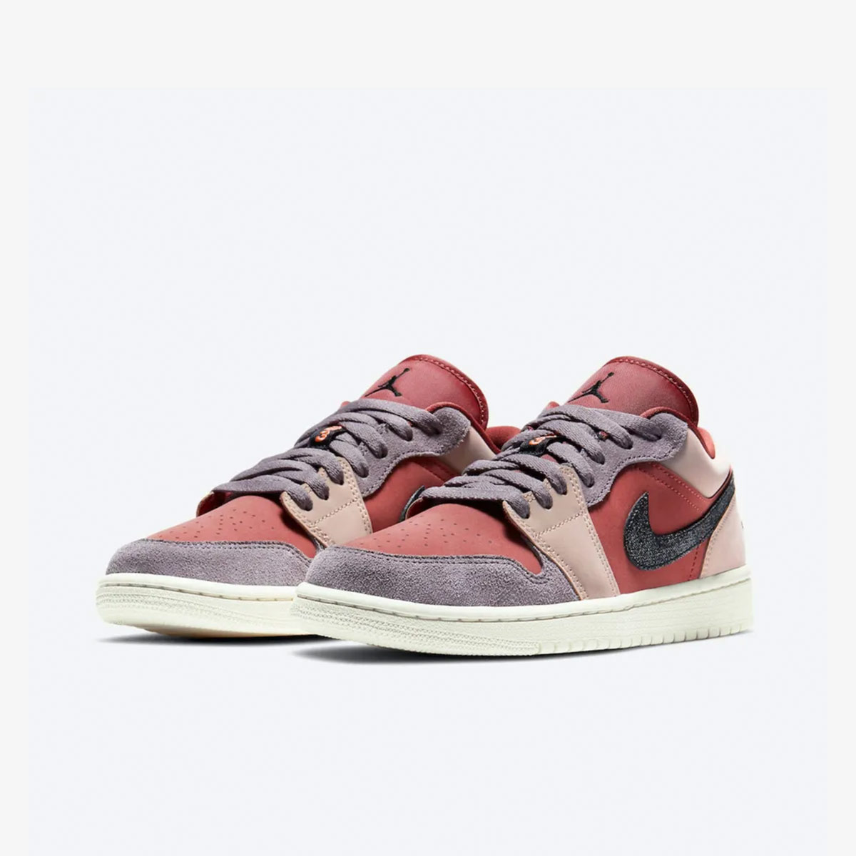- Giày Nike Air Jordan 1 Low “Canyon Rust” (w) DC0774-602 được làm từ vải da lộn, da nubuck và vật liệu tổng hợp, với bảng màu gồm đen và khói tím, dành cho Nữ này có họa tiết nubuck san hô đỏ sẫm màu trên cổ áo từ AJ1 và Lớp phủ da lộn màu tím trên lỗ xỏ dây và hộp ngón chân phù hợp với dây buộc.