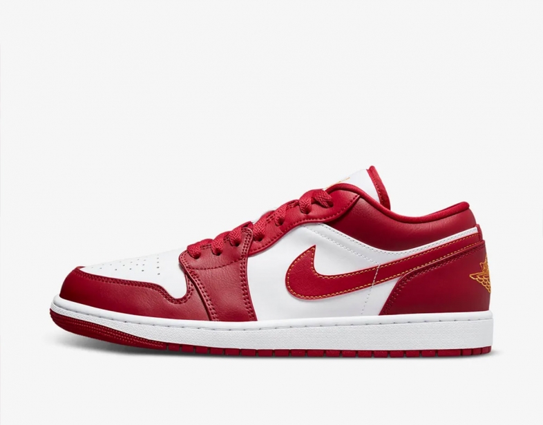 Điểm nổi bật của đôi giày nằm ở tone đỏ Cardinal Red phủ trên phần Swoosh, overlay và gót giày. Nền da trắng giúp tổng thể trở nên cân bằng và làm nổi bật các chi tiết đỏ. Jordan 1 Low “Cardinal Red” những đường stitching màu vàng Light Curry tạo điểm nhấn độc đáo, khiến logo Swoosh và Wings trở nên nổi bật hơn.