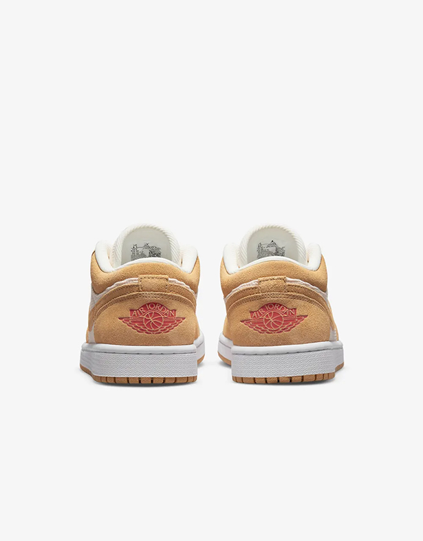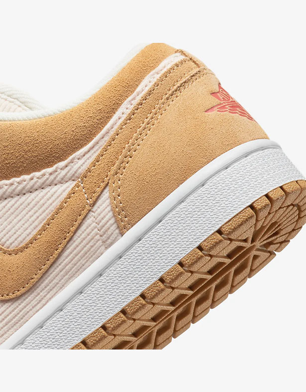 Đặc biệt của đôi giày Nike Air Jordan 1 Low “Corduroy Suede” nằm ở phần upper làm từ vải corduroy mềm mại, với tông hồng phớt nhẹ nhàng. Lớp phủ da lộn (suede) màu nâu vàng (tan) mang đến cảm giác ấm áp và sang trọng. Logo Wings màu coral đỏ sẫm trên gót giày tạo nên sự đối lập đầy tinh tế, đồng thời chi tiết Jumpman thêu trên lưỡi gà cũng được phối cùng gam màu này để tăng thêm tính đồng bộ.