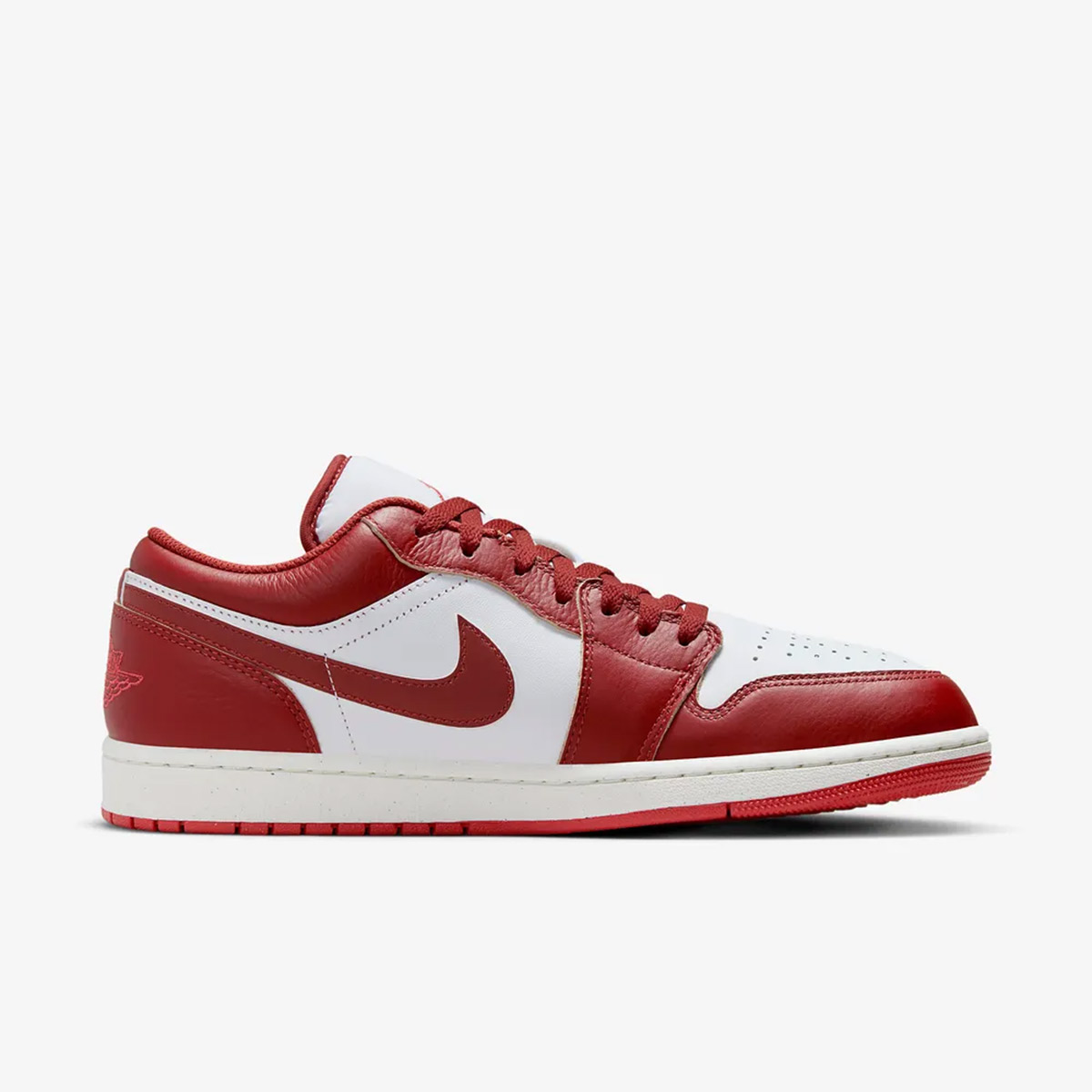 - Giày Nike Air Jordan 1 Low “Dune Red” FJ3459-160 được xây dựng trên nền tảng chất liệu da cao cấp, tạo nên sự bền bỉ và sang trọng. Gam màu đỏ trên các chi tiết như tấm chắn, cổ giày, và gót giày tạo nên sự ấn tượng mạnh mẽ, mảng da màu trắng ở phần mũi và hông giày giữ cho tổng thể trở nên hài hòa.