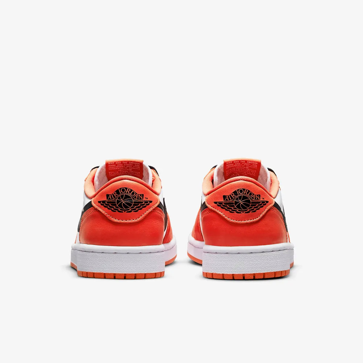 Nike Air Jordan 1 Low OG “Starfish” điểm nhấn của đôi giày còn đến từ chi tiết Swoosh màu đen nổi bật trên nền cam cùng dây giày và logo Wings thêu ở gót cũng mang màu đen tương phản, góp phần hoàn thiện phong cách “Shattered Backboard” đặc trưng. Đế giữa màu trắng cùng đế ngoài cao su màu cam mang lại sự đồng điệu trong thiết kế và đảm bảo độ bám tối ưu trên nhiều bề mặt.