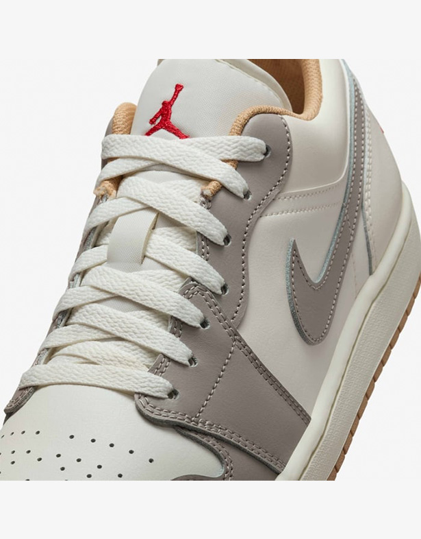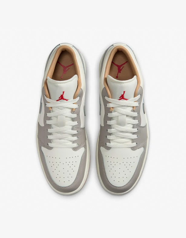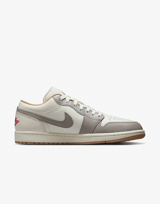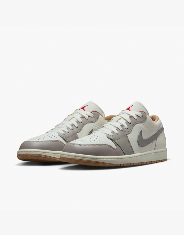 Nike Air Jordan 1 Low “Sail College Grey” mang phối màu và kết hợp khéo léo giữa tông trung tính thanh lịch như xám, trắng ngà và điểm nhấn đỏ rực rỡ. Sự đối lập hài hòa này tạo nên một diện mạo vừa tinh tế, vừa nổi bật, dễ dàng chinh phục cả giới sưu tầm lẫn người yêu thích phong cách đường phố.
