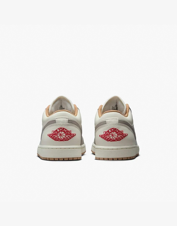 Toàn bộ phần upper được phủ tone trắng ngà Sail nhẹ nhàng, mang hơi thở cổ điển và dễ dàng phối hợp với nhiều outfit. Swoosh màu College Grey ở hai bên tăng thêm chiều sâu và sự cân bằng thị giác. Trên nền trung tính ấy, sắc Fire Red rực rỡ nổi bật ở logo Jumpman và huy hiệu Wings phía gót giày, làm nổi bật Nike Air Jordan 1 Low “Sail College Grey”