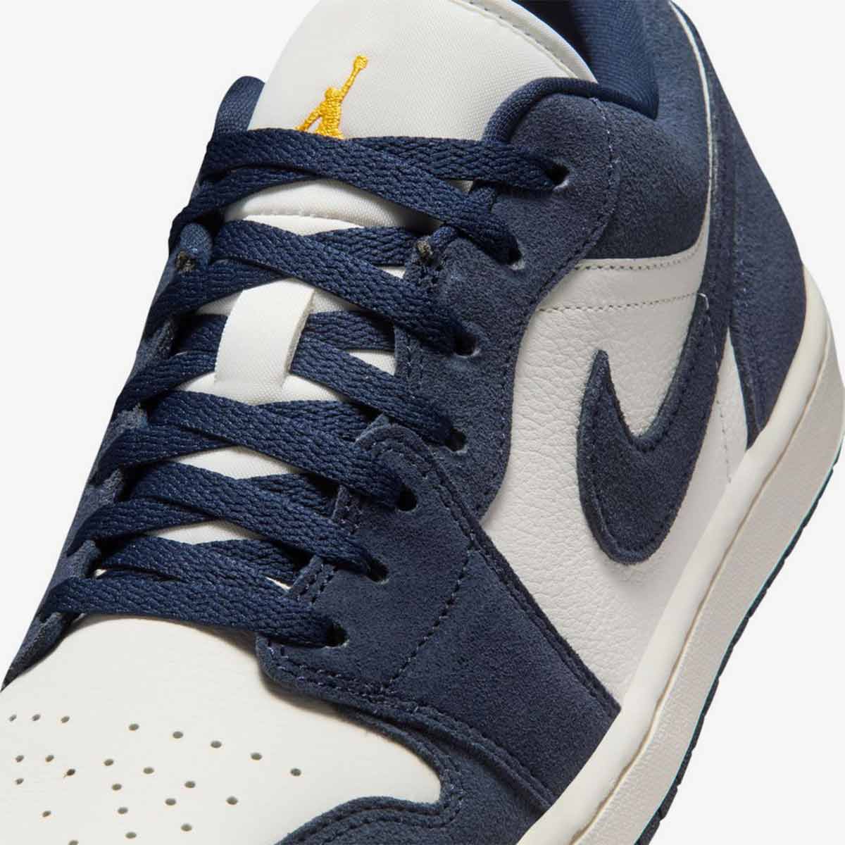 - Giày Nike Air Jordan 1 Low SE “Obsidian” IO7448-400 làm từ da cao cấp, với màu xanh Obsidian đậm da nubuck bao phủ giày, viền dây buộc và các tấm bên hông, trong khi các điểm nhấn màu vàng University Gold rực rỡ mang lại năng lượng cho logo Swoosh, gót và cổ giày. Màu trắng đế giữa và lớp lót bên hông cân bằng bảng màu, tạo nên sự tương phản sạch sẽ, bắt mắt, làm nổi bật kiểu dáng vượt thời gian.