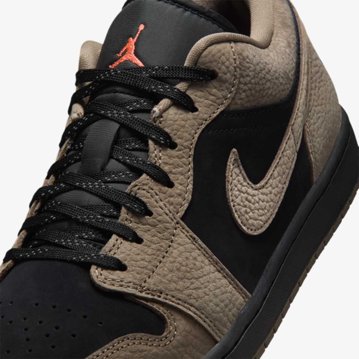 Nếu chỉ toàn màu trầm, có lẽ đôi giày sẽ hơi đơn điệu. Chính vì vậy, Nike đã khéo léo đưa vào logo Jumpman màu “Light Wild Mango” (màu xoài hoang dã) nổi bật ngay trên lưỡi gà. Chi tiết nhỏ này đóng vai trò như gợi nhớ về những thiết kế AJ1 Low cổ điển, mang lại sự trẻ trung mà không làm mất đi vẻ sang trọng tổng thể.