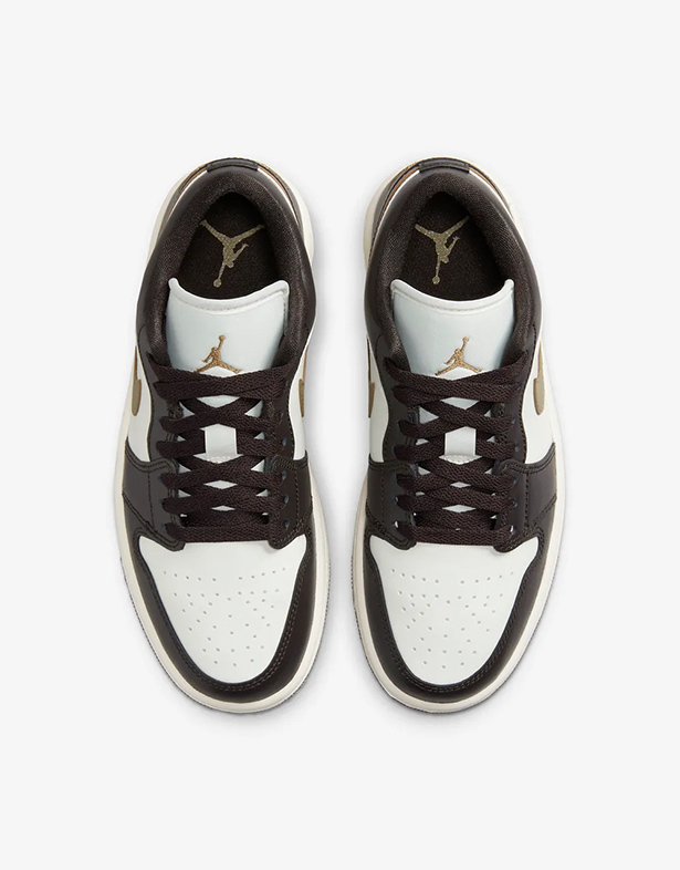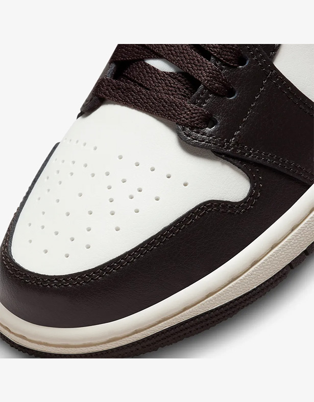 Đôi giày Nike Air Jordan 1 Low “Shadow Brown” sở hữu phần upper bằng da trắng cao cấp, mang lại sự thoáng khí và cảm giác thoải mái khi di chuyển. Điểm nhấn đến từ các lớp da đen phủ trên toebox, dây giày và gót giày, giúp tạo nên sự tương phản đầy nổi bật. Phần Swoosh màu Shadow Brown chạy dọc thân giày chính là chi tiết đặc biệt, mang đến nét sang trọng và khác biệt cho tổng thể.