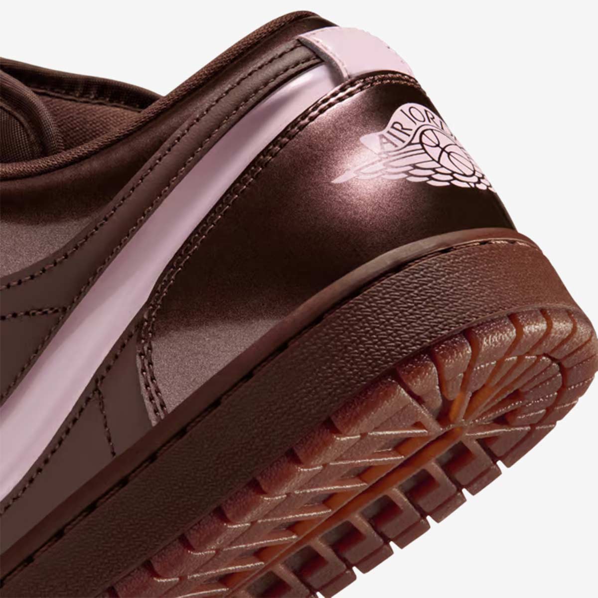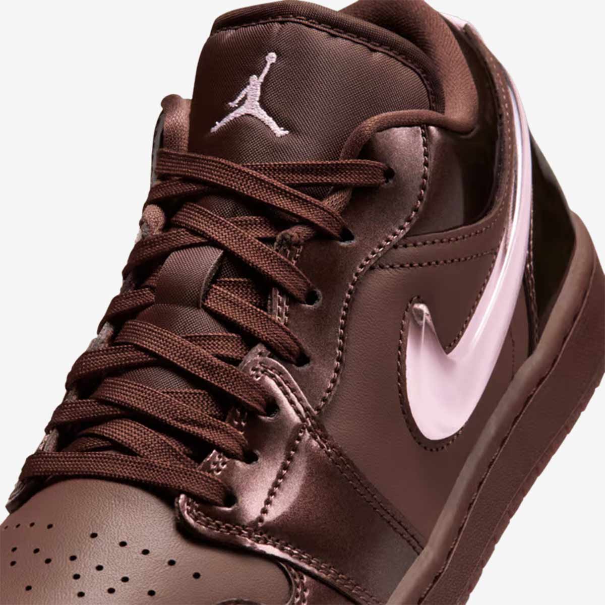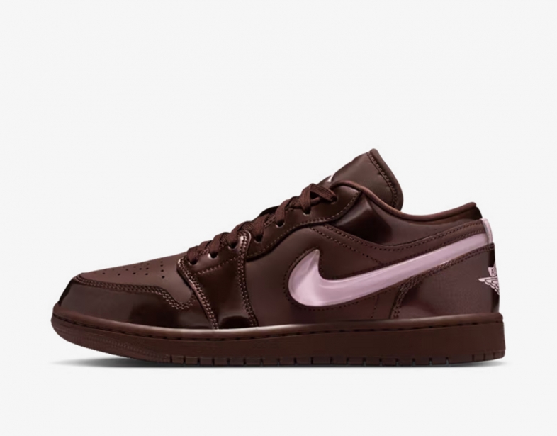 Air Jordan 1 Low sử dụng da cao cấp làm nền tảng, với lớp da bóng patent trên phần mũi giày, mắt gà, cổ và gót. Tông màu nâu socola chủ đạo được phân tầng từ nhạt đến đậm, tạo chiều sâu như hộp kẹo Valentine. Swoosh bên ngoài làm từ TPU trong suốt lộ lớp Pink Foam bên trong, trong khi Swoosh bên trong là da hồng đơn giản. Logo Wings in trên gót và Jumpman thêu trên lưỡi gà nhấn mạnh thương hiệu.