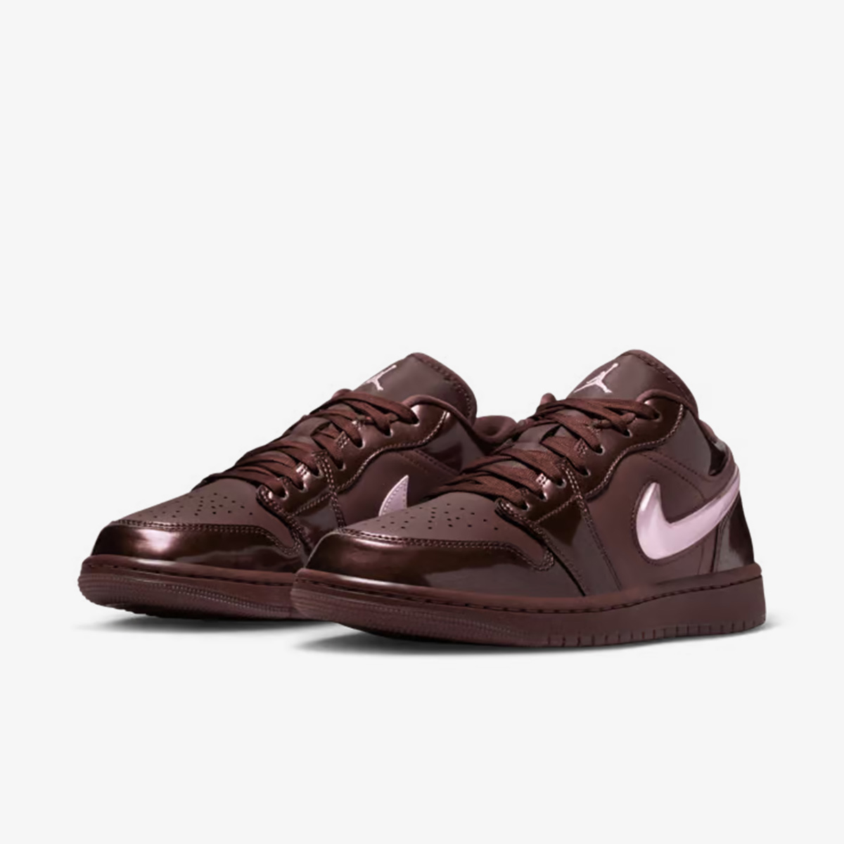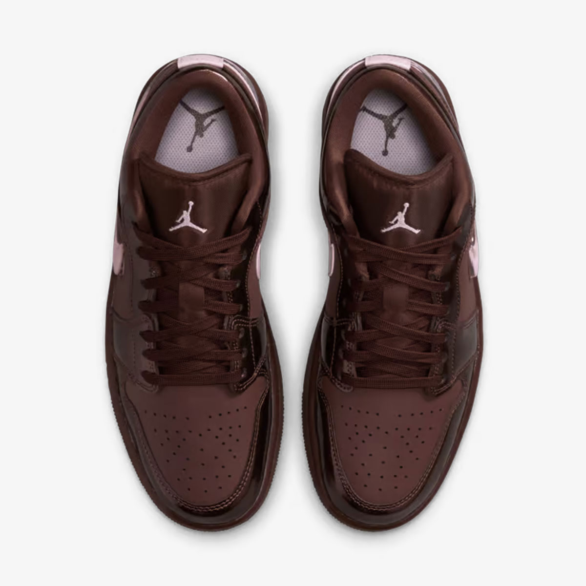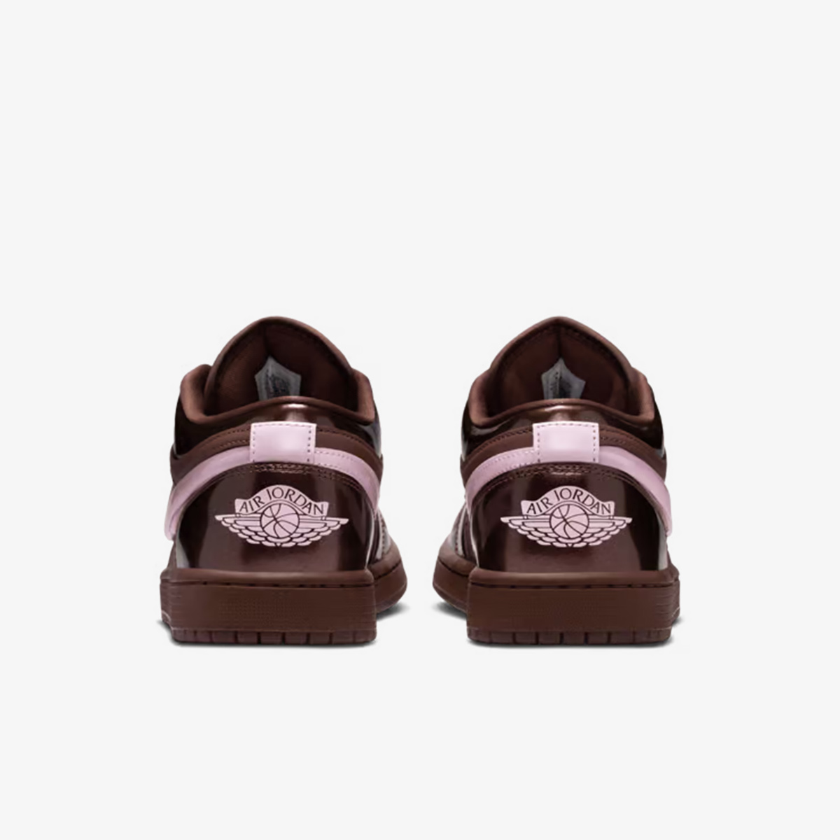 Air Jordan 1 Low sử dụng da cao cấp làm nền tảng, với lớp da bóng patent trên phần mũi giày, mắt gà, cổ và gót. Tông màu nâu socola chủ đạo được phân tầng từ nhạt đến đậm, tạo chiều sâu như hộp kẹo Valentine. Swoosh bên ngoài làm từ TPU trong suốt lộ lớp Pink Foam bên trong, trong khi Swoosh bên trong là da hồng đơn giản. Logo Wings in trên gót và Jumpman thêu trên lưỡi gà nhấn mạnh thương hiệu.