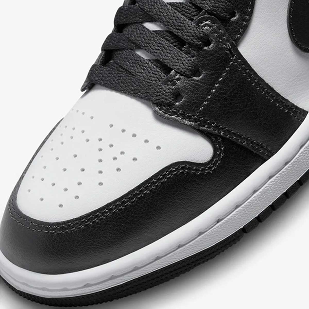 Điểm cộng lớn nhất của Jordan 1 Mid Panda phiên bản nữ này là chất liệu da cao cấp. So với các phiên bản Mid thông thường, da có độ mềm vừa phải nhưng vẫn giữ được form dáng đứng form rất tốt. Lớp nền màu trắng (White foundation) tạo độ sáng, trong khi các lớp phủ màu đen (Black overlays) được cắt may tỉ mỉ, không có chỉ thừa.