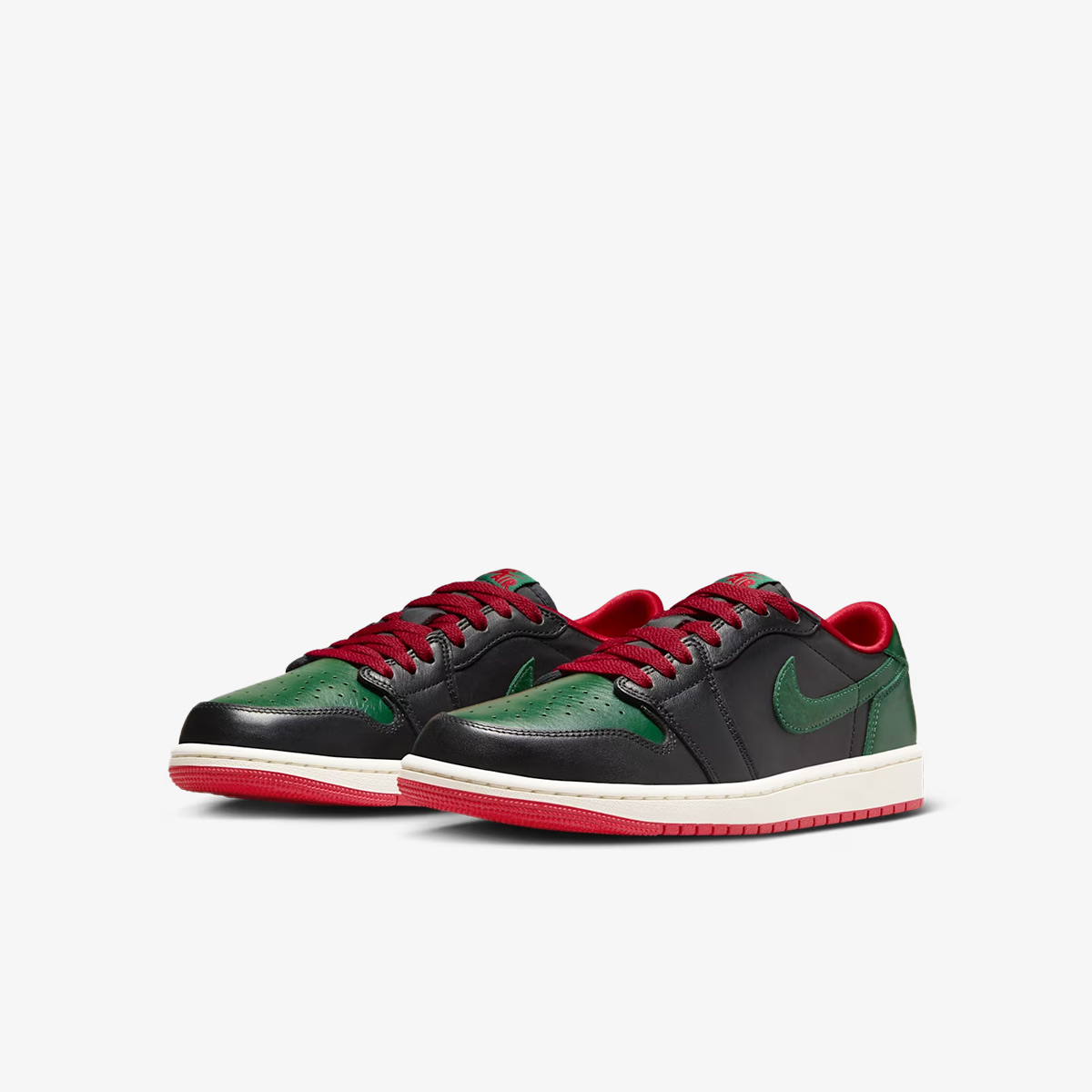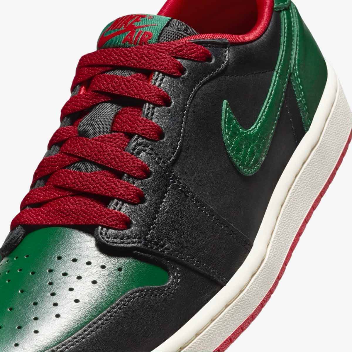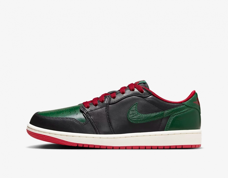 Điểm nhấn đầu tiên của Jordan 1 Low Gorge Green chính là sự kết hợp màu sắc táo bạo nhưng hài hòa. Trên nền da màu đen (Black) chủ đạo ở thân giày, Nike đã khéo léo lồng ghép các lớp phủ màu xanh lá đậm (Gorge Green) ở mũi giày, gót giày và dấu Swoosh đặc trưng. Chưa dừng lại ở đó, sự xuất hiện của các chi tiết màu đỏ (Varsity Red) trên dây giày, logo Wings ở gót và lưỡi gà tạo nên độ tương phản mạnh mẽ. Chính sự kết hợp giữa Xanh lá, Đỏ và Đen đã tạo nên cái tên không chính thức là Jordan 1 Low Gucci, mang lại vẻ ngoài vừa cổ điển vừa sang trọng.