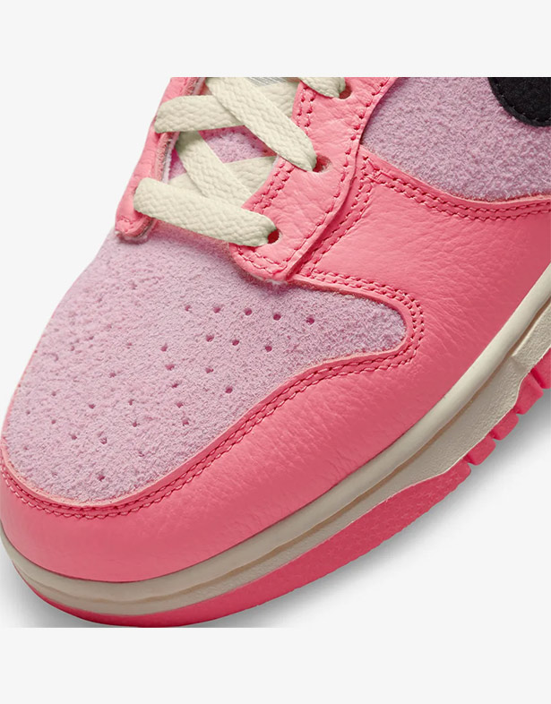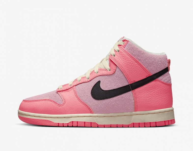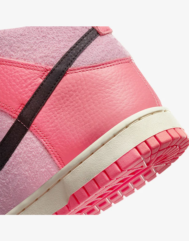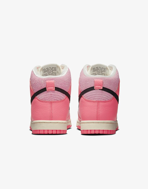 Nike Dunk High “Hoops Pack Pink” sở hữu phần upper được làm từ sự kết hợp giữa da và da lộn, mang đến cảm giác mềm mại và độ bền cao. Hai tông màu hồng một hồng nhạt và một hồng đậm được phối hợp tinh tế, tạo nên vẻ ngoài nữ tính nhưng vẫn đầy cá tính. Điểm nhấn là logo Swoosh màu đen nổi bật trên nền hồng, cùng các chi tiết trắng ngà ở dây giày, lưỡi gà và đế giữa, giúp tổng thể trở nên hài hòa.