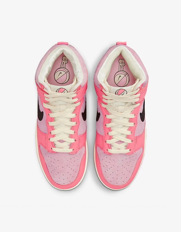 Một trong những điểm đặc biệt của mẫu giày Nike Dunk High “Hoops Pack Pink” này chính là biểu tượng bóng rổ kết hợp dấu hiệu hòa bình một thiết kế riêng dành cho dòng “Hoops Pack”. Logo này xuất hiện trên lưỡi gà và lót giày, tạo nên sự khác biệt so với các phiên bản Dunk thông thường.