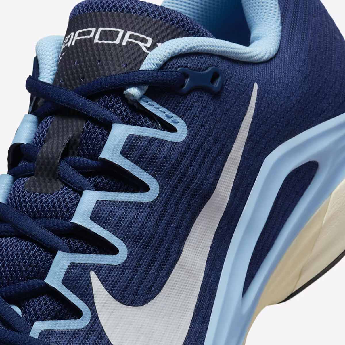 Phần thân giày NikeCourt Vapor 12 HC “Midnight Navy” được làm từ lưới kỹ thuật (engineered mesh) siêu nhẹ, giúp thoáng khí và giảm trọng lượng tổng thể. Những lớp phủ tổng hợp được bố trí chiến lược tại các vùng chịu áp lực giúp tăng độ bền mà không làm giảm tính linh hoạt.
